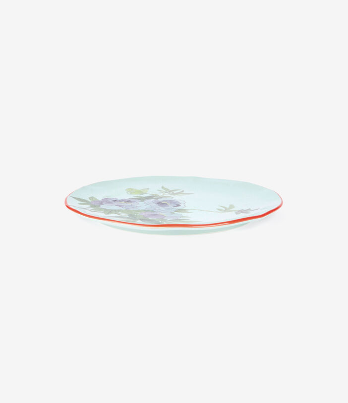 TRAY is a round ceramic tray celebrating the poetry of nature with a peony and butterfly motif on a soft light blue background. A coral red rim enhances the gentle design, while the subtly irregular shape adds an artisanal touch. Elegant and versatile, it’s ideal for graceful serving or refined decoration. It belongs to a complete set featuring plates in various sizes, bowls, trays and coordinated items for a distinctive and refined table.